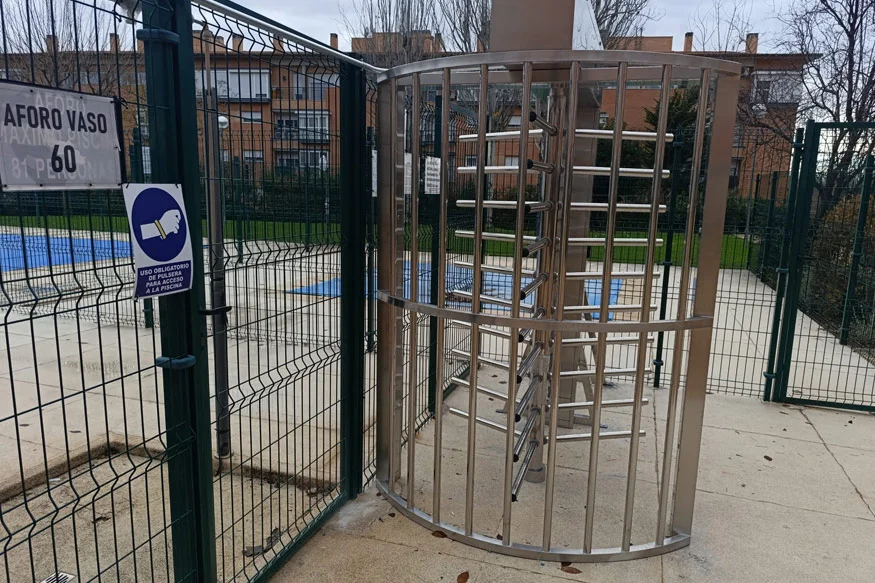 El molinete es el control de acceso más fiable, se trata de una jaula de materiales resistentes que soportan temperaturas adversas, tanto el sol del verano y la gente que sale o entra mojada a la piscina, como la lluvia.